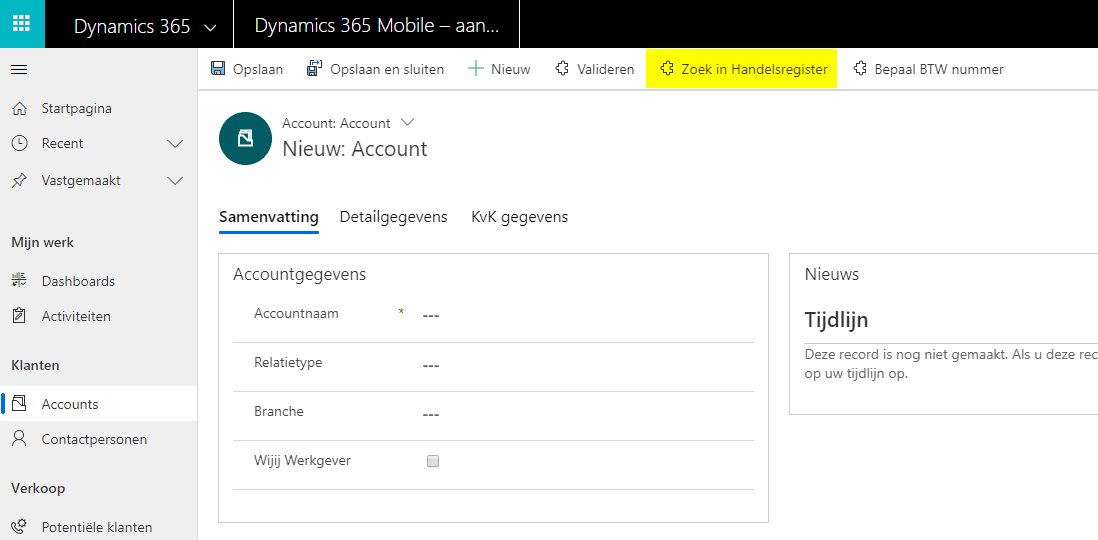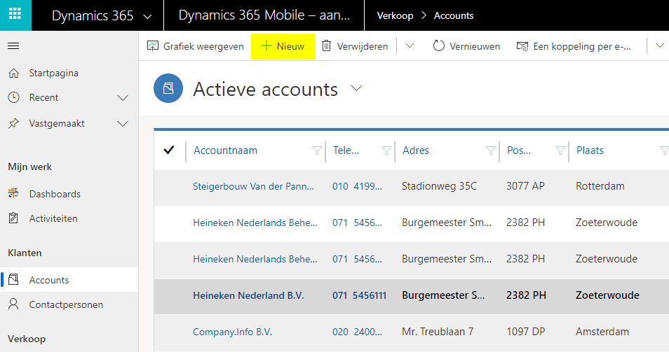 De onderstaande beschrijving somt de stappen op om een account of een lead (potentiële klant) toe te voegen: ga naar Account en klik op Nieuw: