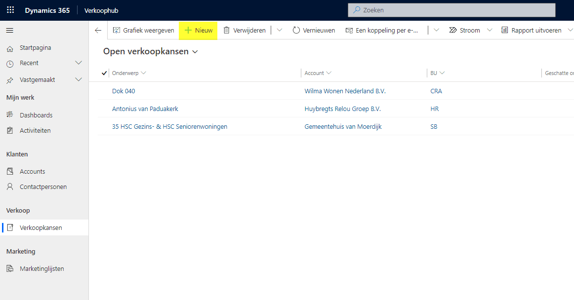 Ga aan de linkerkant naar “Verkoopkansen” en voeg binnen Dynamics 365 CE een nieuwe verkoopkans toe: